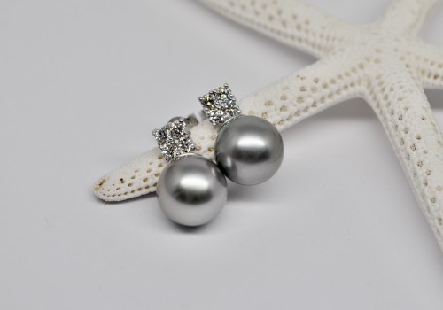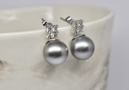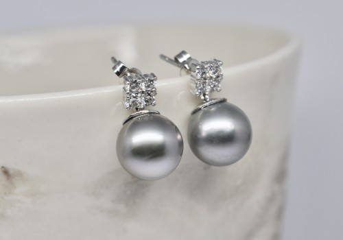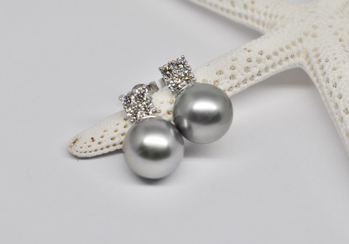 These elegant symmetric studs are sculpted in 18k white gold with light grey Tahitian Pearls. They have a diameter of 10-11mm. The square consists of 4 diamonds with a total of 0,25ct.