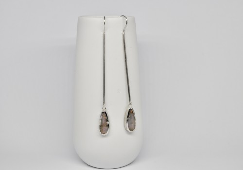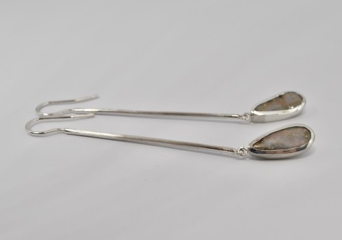 Long boulder opals are dangling from sterling silver rod and ear wire. The teardrop shaped opals measure approximately 12mm in length.
