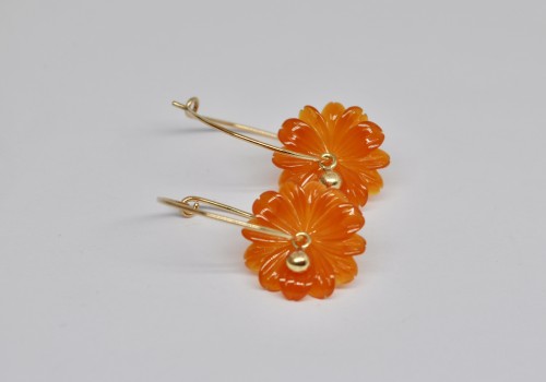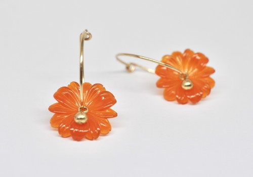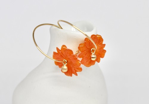 18k Yellow Gold Hoop Earrings with Orange Agate Flowers