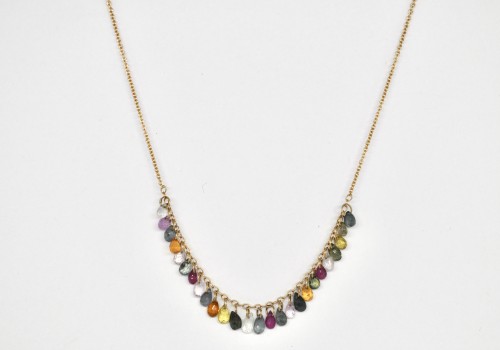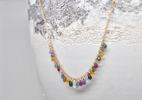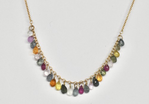 Small sapphire drops in various colours and sizes are dangling from the middle section of a delicate 18k yellow gold chain.