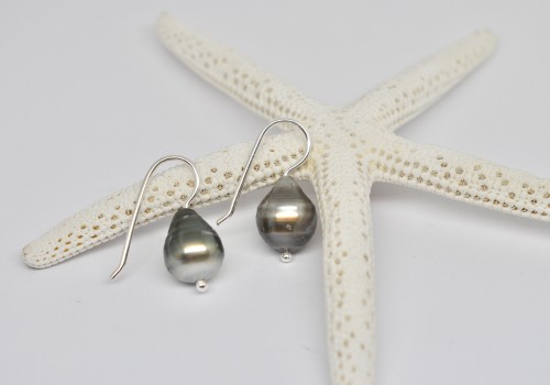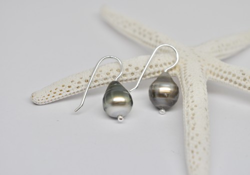 Modern and minimalist drop earrings handmade from sterling silver with two teardrop Tahitian pearls in natural light grey.