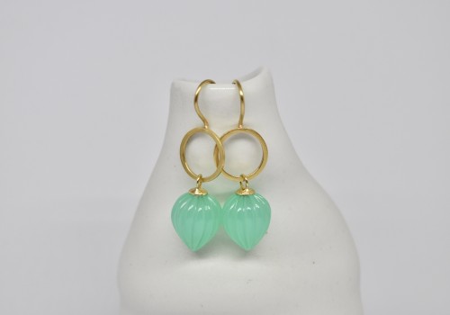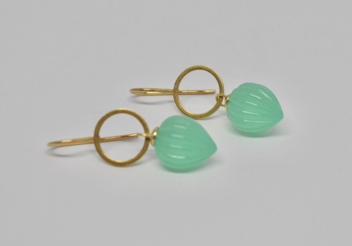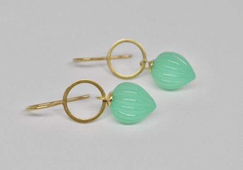 Light green chrysoprase drops are hanging from gold circles and are attached to gold ear wire.