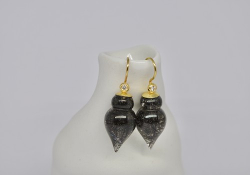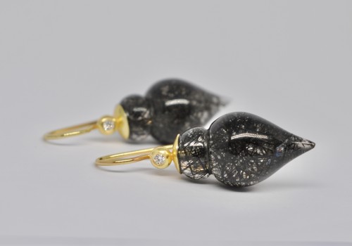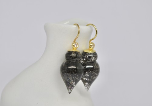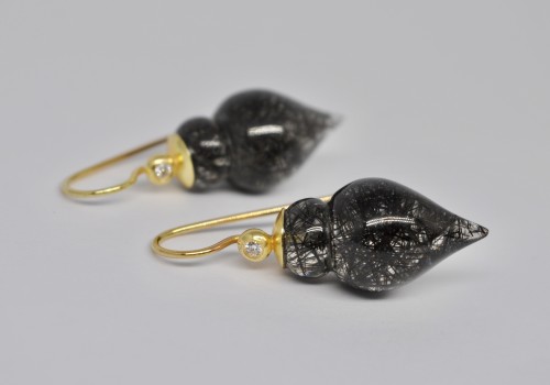 These exquisite and one of a kind earrings feature uniquely patterned rutilated tourmaline quartz drops paired with polished 18k yellow gold hooks and a sparkling diamond. Their striking contrast and refined shape make them a standout piece for both everyday wear and special occasions.