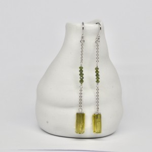 Dangle 18k White Gold Chain Earrings, Yellow Tourmaline Crystals, Green Diamond Beads