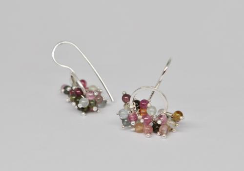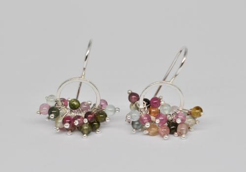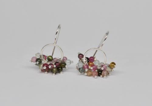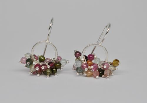 Silver circle earrings with a cluster of multicolored tourmaline beads.