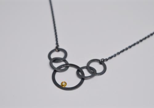 5 oxidized silver circles are suspended from a solid oxidized sterling silver chain. The necklace measures 45cm in length and is secured with a lobster clasp. The larger middle link is accentuated by a 2mm white diamond to add uniqueness and individuality. The diamond is set in 18karat yellow gold.