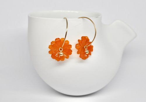 18k Yellow Gold Hoop Earrings with Orange Agate Flowers