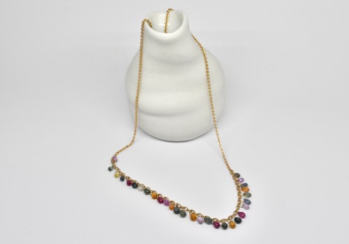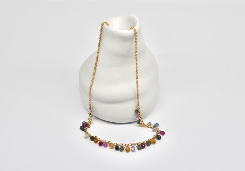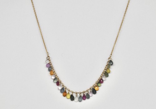 Small sapphire drops in various colours and sizes are dangling from the middle section of a delicate 18k yellow gold chain.
