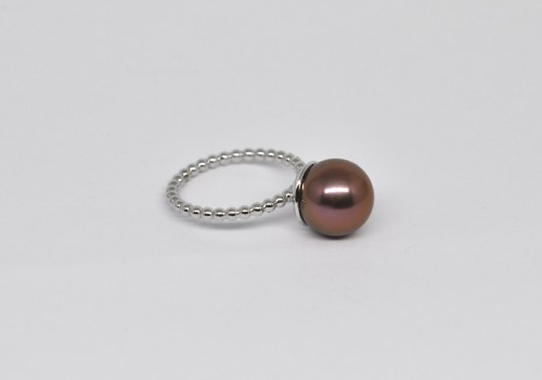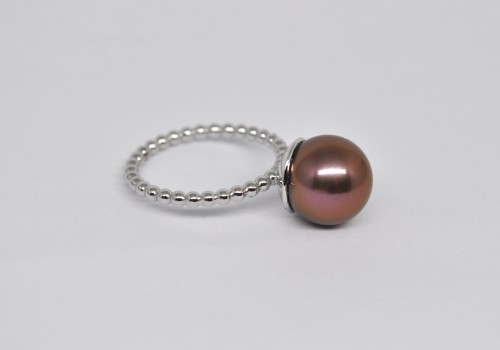 Solid 18K white gold pearl wire ring with Edison pearl. The round freshwater pearl sits in an 18k white gold dish and measures 11mm in diameter. It has an exquisite purple colour and a magnificent luster. It is beautiful when worn as a single piece and also stunning when worn together as stacking rings.
