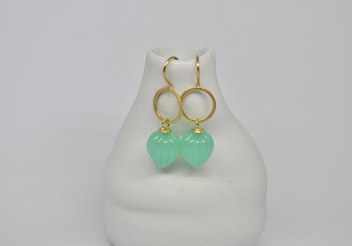 Light green chrysoprase drops are hanging from gold circles and are attached to gold ear wire.